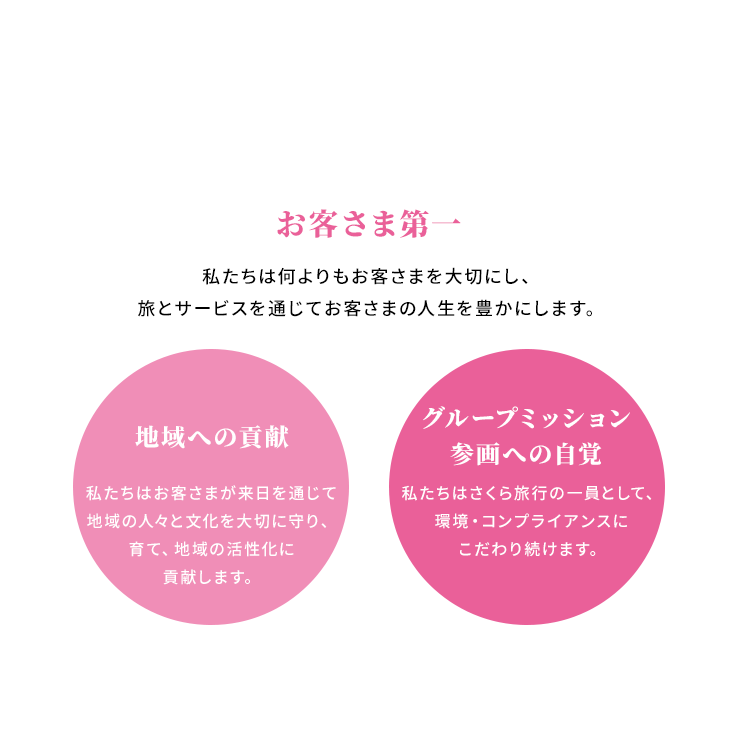 - 私たちは何よりもお客さまを大切にし、旅とサービスを通じてお客さまの人生を豊かにします。